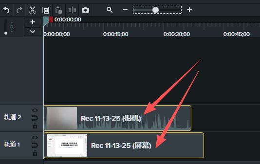 3、结束录制之后,录制好的素材会自动出现在下方的剪辑轨道上,并且屏幕录制素材和摄像头录制素材是分开的。